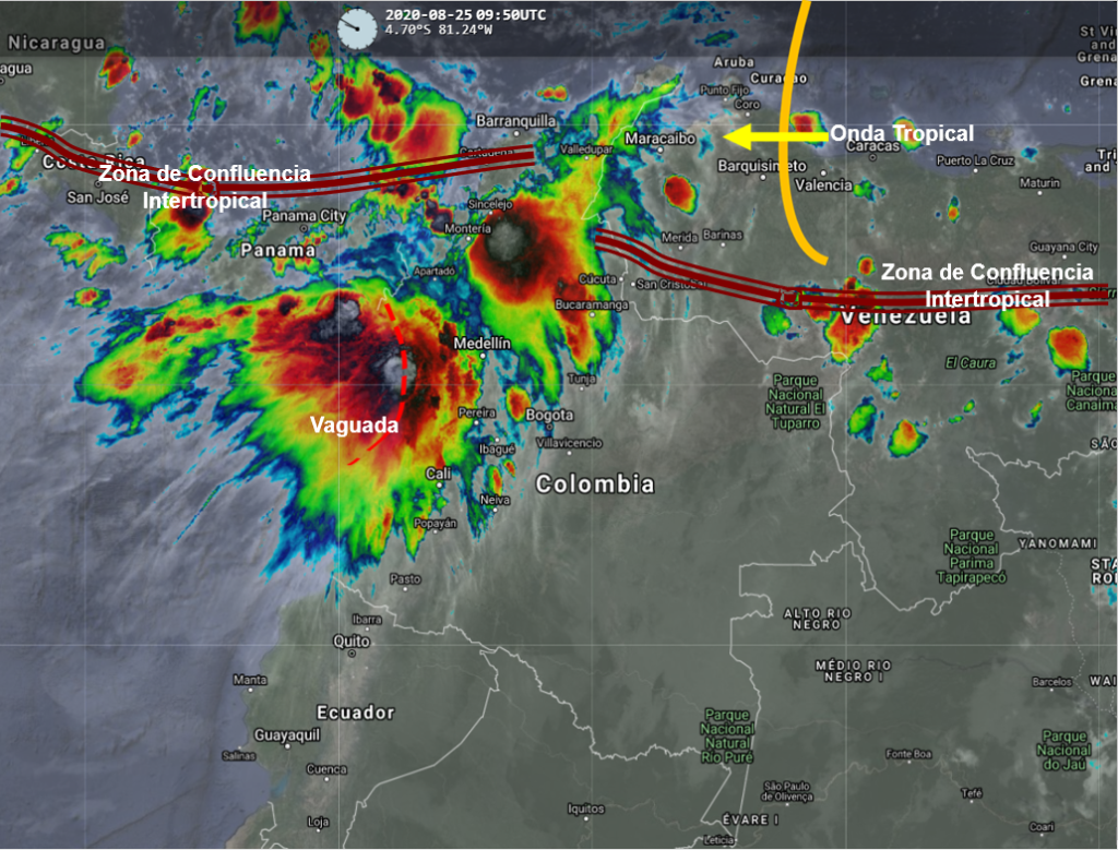 La interacción de la Zona de Confluencia Intertropical con una vaguada en el pacífico y el paso continuo de Ondas Tropicales del Este, generan inestabilidad atmosférica en varias partes de la región Caribe, Andina y Pacífica, produciendo lluvias moderadas y fuertes, algunas acompañadas de actividad eléctrica, en sectores de los departamentos de Cesar, Magdalena, Atlántico, Bolívar, Sucre, Córdoba, Chocó, Antioquia, Valle, Eje Cafetero, Tolima, Cundinamarca, Boyacá, Santander y Norte de Santander, especialmente en horas de la tarde. Precipitaciones de menor intensidad en Arauca, Casanare, Meta, Vichada, Cauca y Nariño.