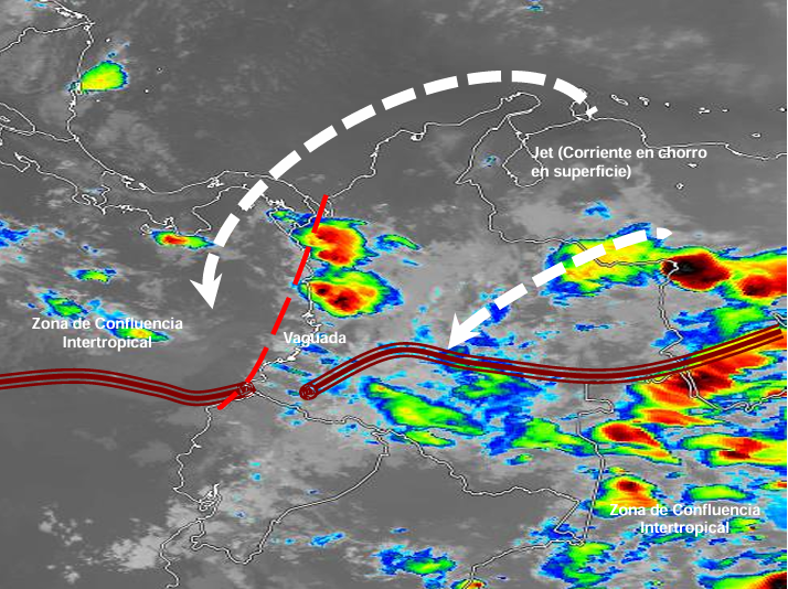 El ramal Pacífico de la Zona de Confluencia Intertropical en interacción con una Vaguada, un Sistema de Baja Presión, el ingreso de humedad por el Suroriente del país y procesos convectivos locales favorecen condiciones inestables que generan lluvias ligeras a moderadas y algunas tormentas en sectores de los departamentos de Amazonas, Vaupés, Guainía, Vichada, Santanderes, Boyacá, Cundinamarca, Antioquia, Chocó, Valle del Cauca, Cauca y Nariño, precipitaciones ocasionales y lluvias de menor intensidad en sectores de los departamentos de Sur de Bolívar, Eje Cafetero, Tolima, Huila, Putumayo, Caquetá y Guaviare.