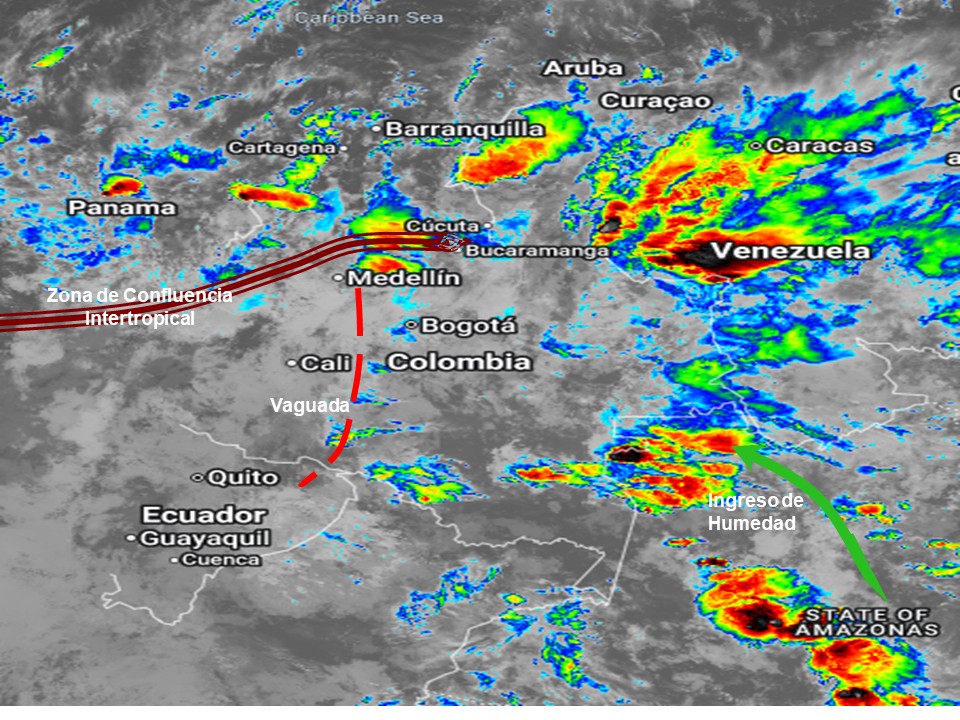 El ramal Pacífico de la Zona de Confluencia Intertropical en interacción con una Vaguada, un Sistema de Baja Presión, así como procesos convectivos locales favorecen condiciones inestables, que generan lluvias ligeras a moderadas y algunas tormentas en sectores de los departamentos de Santanderes, Boyacá, Cundinamarca, Chocó, Valle del Cauca, Cauca, Nariño, Caquetá, Guaviare, Vichada, Guainía, Vaupés y Amazona, Cesar, Magdalena, Bolívar, Sucre, Córdoba, Antioquia, s. Precipitaciones ocasionales y lluvias de menor intensidad en los departamentos de Putumayo, Tolima, Huila y Eje Cafetero.