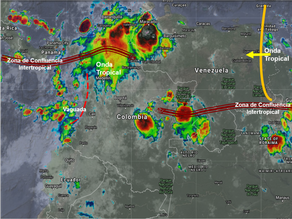 El ramal pacifico de la Zona de Confluencia Intertropical en interacción con una vaguada, así como el paso continuo de Ondas Tropicales del Este, generan nubosidad convectiva que favorece la presencia de lluvias de variada intensidad en sectores de la región Pacífica, Andina, Caribe y Orinoquia, afectando principalmente los departamentos de Chocó, Valle, Cauca, Nariño, Córdoba, Sucre, Bolívar, Magdalena, Atlántico, Cesar, Guajira, Antioquia, Norte de Santander, Santander, Cundinamarca, Boyacá, Meta, Casanare, Arauca, Vichada y Vaupés.