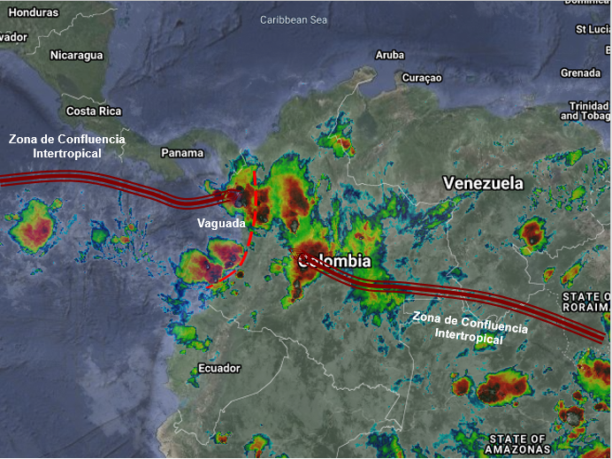 La interacción del ramal Pacífico de la Zona de Confluencia Intertropical con una Vaguada y el ingreso de humedad por el suroriente del país, favorece condiciones inestables en gran parte de las regiones Andina, Pacífica, y Amazónica. Especialmente en horas de la tarde y noche se prevén lluvias moderadas a fuertes y tormentas en el Piedemonte Llanero, Arauca, Meta, Vichada, Guainía, Guaviare, Vaupés, Amazonas, Caquetá, Putumayo, Nariño, Huila, Tolima, Cauca, Valle del Cauca, Chocó, Eje Cafetero, Antioquia, Boyacá, Santanderes, Magdalena y Bolívar. Precipitaciones de menor intensidad en Cundinamarca, Córdoba y Sucre
