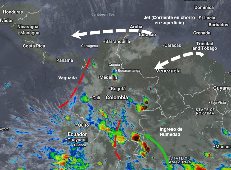 El ramal Pacífico de la Zona de Confluencia Intertropical, en interacción con dos vaguadas, un Sistema de Baja Presión, el ingreso de humedad desde el suroriente del país y procesos convectivos locales favorecen condiciones inestables, que generan lluvias ligeras a moderadas y algunas tormentas en sectores de los departamentos de Amazonas, Antioquia, Atlántico, Bolívar, Boyacá, Caldas, Caquetá, Cauca, Cesar, Chocó, Córdoba, Cundinamarca, Guainía, Guaviare, La Guajira, Magdalena, Nariño, Norte de Santander, Putumayo, Quindío, Risaralda, Santander, Sucre, Tolima, Valle del Cauca, Vaupés y Vichada. Precipitaciones ocasionales y lluvias de menor intensidad en los departamentos de Arauca, Casanare, Meta y Huila.
