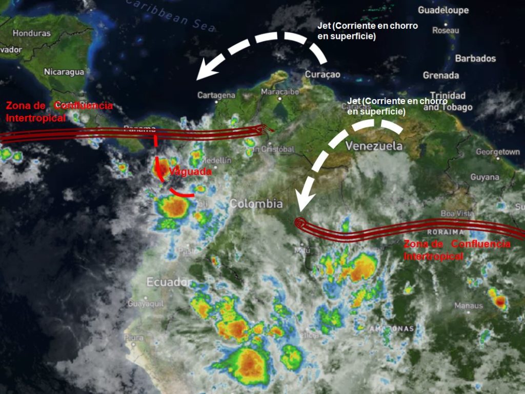 La Zona de Confluencia Intertropical (ZCIT) en interacción con una Vaguada, propicia inestabilidad atmosférica en el occidente y centro-occidente del país, Corrientes en chorro en superficie, generan vientos fuertes en Litoral Caribe y en la Orinoquia Colombiana.