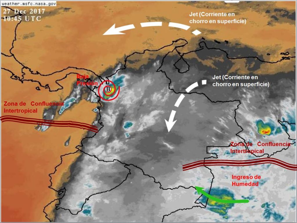 La Zona de Confluencia Intertropical (ZCIT) en interacción con un sistema de Baja Presión y el ingreso de humedad generan inestabilidad atmosférica en el occidente, centro y suroriente del país, especialmente durante casi todo el día. Para la región Caribe cielo parcialmente nublado con predominio de condiciones secas y vientos fuertes de hasta 28 nudos (56 Km/h).