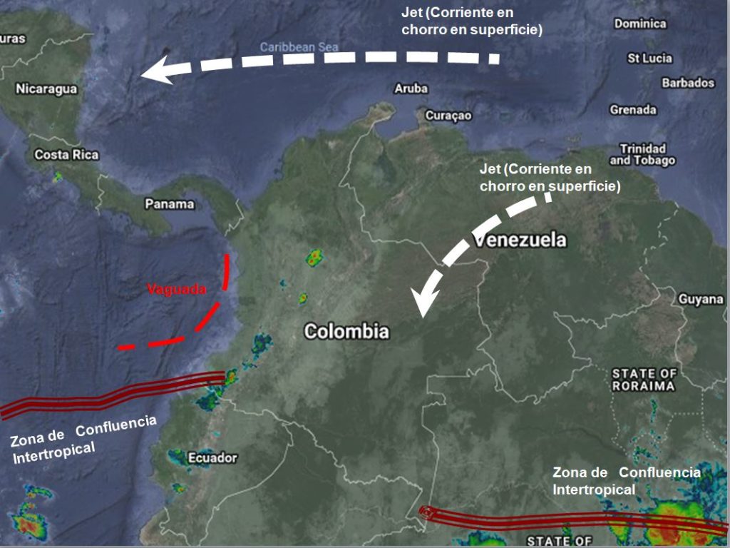 Condiciones de tiempo seco en el norte, oriente y suroriente del país. Una Vaguada favorece inestabilidad atmosférica al occidente y suroccidente. Corrientes en Chorro en superficie (LLJ) continúan generando vientos fuertes en la región Caribe con intensidades de entre 20 y 30 nudos (40 a 60 Km/h) y en la Orinoquia con intensidades de 15 a 20 nudos (30 a 40 Km/h).