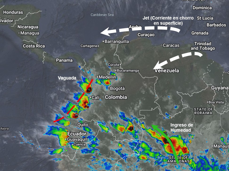 El ramal Pacífico de la Zona de Confluencia Intertropical, en interacción con una vaguada, un Sistema de Baja Presión, el ingreso de humedad desde el suroriente del país y procesos convectivos locales favorecen condiciones inestables, que generan lluvias ligeras a moderadas y algunas tormentas en sectores de los departamentos de Amazonas, Antioquia, Caldas, Cauca, Chocó, Córdoba, Cundinamarca, Guainía, Magdalena, Nariño, Putumayo, Quindío, Risaralda, Santander, Sucre, Valle del Cauca y Vaupés. Precipitaciones ocasionales y lluvias de menor intensidad en los departamentos de Arauca, Casanare, Meta, Guaviare, Vichada, Caquetá, Norte de Santander, La Guajira, Atlántico, Bolivar, Cesar, Tolima, Neiva, Boyacá y Huila.