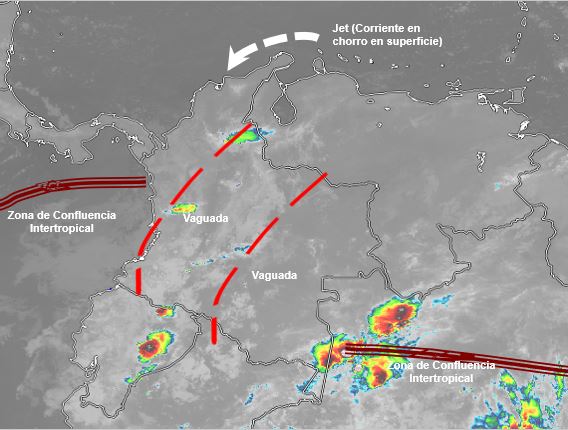 Vaguadas en niveles bajos generan inestabilidad en el occidente, centro y sur del país, lluvias de variada intensidad y algunas tormentas, especialmente en horas de la tarde y noche en sectores de los departamentos de Santander, Boyacá, Cundinamarca, Antioquia, Caldas, Risaralda, Tolima, Huila, Valle del Cauca, Cauca, Nariño, Caquetá, Meta, Piedemonte Llanero, Amazonas y Vaupés.