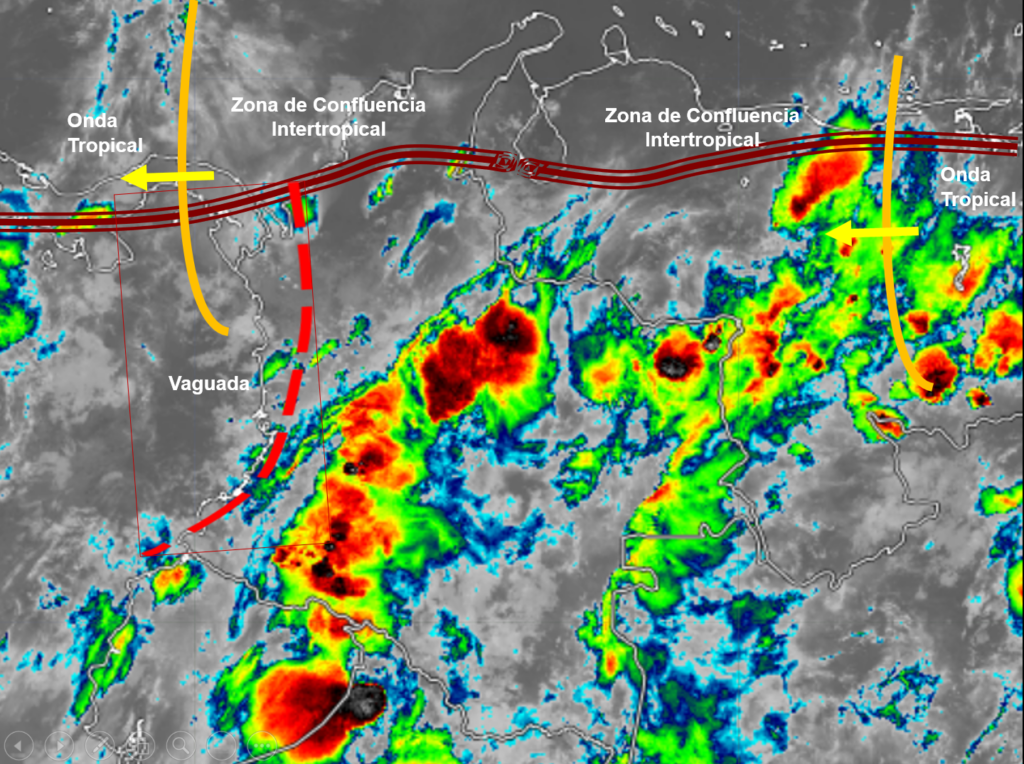 La interacción de la Zona de Confluencia Intertropical con una Vaguada en el Pacífico, el paso de unas Ondas Tropicales del Este y procesos convectivos locales generan condiciones inestables en gran parte del territorio nacional, lluvias moderadas a fuertes y tormentas en sectores de los departamentos de Norte de Santander, Boyacá, Cundinamarca, Caquetá, Amazonas, Antioquia y Eje Cafetero. Precipitaciones ocasionales y lluvias de menor intensidad en Cauca, Valle del Cauca, Nariño, Huila, Guajira, Magdalena, Vichada, Guainía y Vaupés.