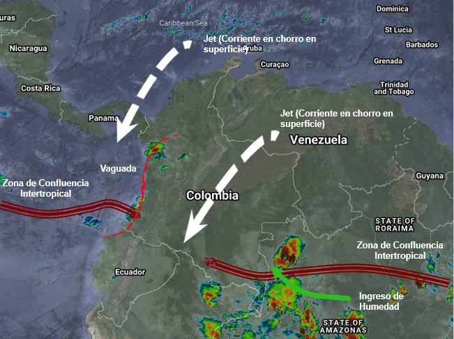 La interacción del ramal Pacifico de La Zona de Confluencia Intertropical (CFIT) con una Vaguada en niveles bajos genera inestabilidad atmosférica en el occidente y suroccidente del país, favoreciendo lluvias de variada intensidad y algunas tormentas aisladas durante toda la jornada a lo largo del litoral y en sectores de los departamentos de Nariño, Cauca, Valle del Cauca, Chocó y el occidente de Antioquia. El ingreso de humedad desde el suroriente genera lluvias ligeras y sectorizadas en Amazonas, Vaupés y Guainía. Procesos convectivos locales generan precipitaciones ocasionales en Tolima, Cundinamarca y Boyacá. Para la región Caribe se mantienen condiciones de tiempo seco y soleado, así como vientos fuertes en su zona marítima con intensidades de entre 25 y 35 nudos (45 a 63 km/h). En la Orinoquia condiciones de tiempo seco.
