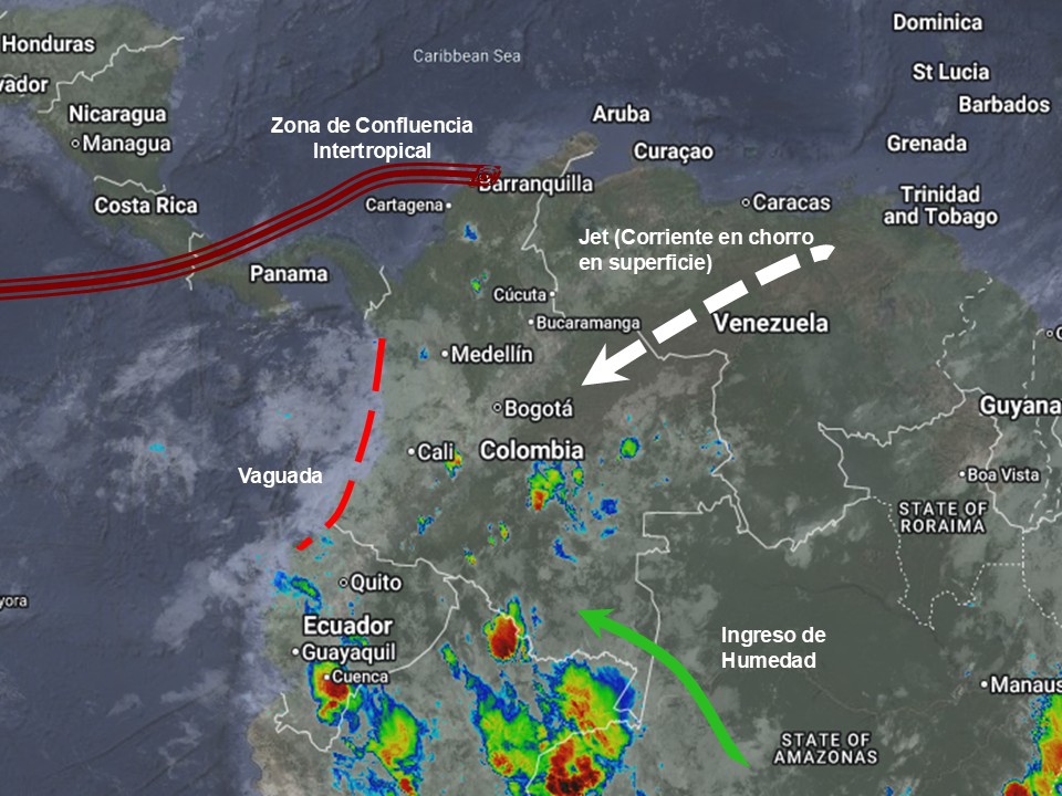El ramal Pacífico de la Zona de Confluencia Intertropical en Interacción con una vaguada y procesos convectivos locales favorecen condiciones inestables, que generan lluvias ligeras a moderadas y algunas tormentas en sectores de los departamentos de Magdalena, Atlántico, Bolivár, Sucre, Córdoba, Antioquia, Chocó, Valle del Cauca, Cauca, Nariño, Huila, Tolima, Cundinamarca, Boyacá, Los Santanderes, Eje Cafetero, Meta, Vichada, Guainía, Guaviare, Caquetá, Vaupés y Amazonas. Precipitaciones ocasionales y lluvias de menor intensidad en los departamentos de La Guajira, Cesar, Arauca y Casanare.