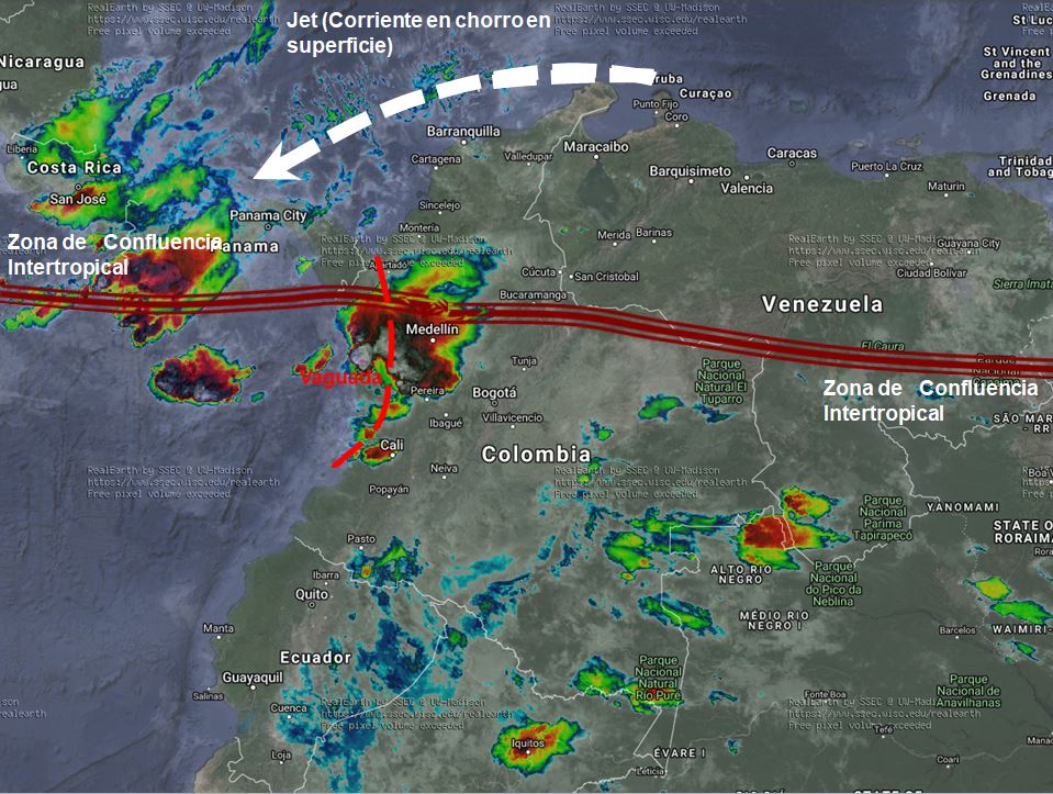 La Zona de Confluencia Intertropical, en interacción con una vaguada genera inestabilidad atmosférica en el occidente y suroccidente del país. Lluvias de moderadas a fuertes y tormentas en Chocó, Antioquia, Eje Cafetero, Valle del Cauca y Cauca. El ingreso de humedad desde el suroriente genera lluvias de variada intensidad en los departamentos de la Amazonia, especialmente en horas de la tarde. La región Caribe con predominio de tiempo seco y vientos fuertes en su zona marítima con intensidades entre 25 y 35 nudos (50 y 70 km/h).