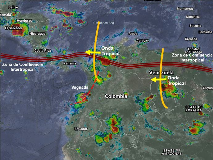 El ramal Pacifico de la Zona de Confluencia Intertropical en interacción con una Vaguada, y el paso de Ondas Tropicales del Este, generan lluvias de variada intensidad en gran parte del territorio nacional, afectando principalmente sectores de los departamentos de La Guajira, Cesar, Magdalena, Atlántico, Bolívar, Sucre, Córdoba, Antioquia, Santanderes, Boyacá, Arauca, Casanare, Vichada, Meta, Eje Cafetero, Chocó, Valle del Cauca, Cauca y Nariño. Precipitaciones ocasionales y lluvias de menor intensidad en Boyacá, Cundinamarca, Tolima, Huila, Putumayo, Caquetá, Guaviare, Guainía, Vaupés y Amazonas.