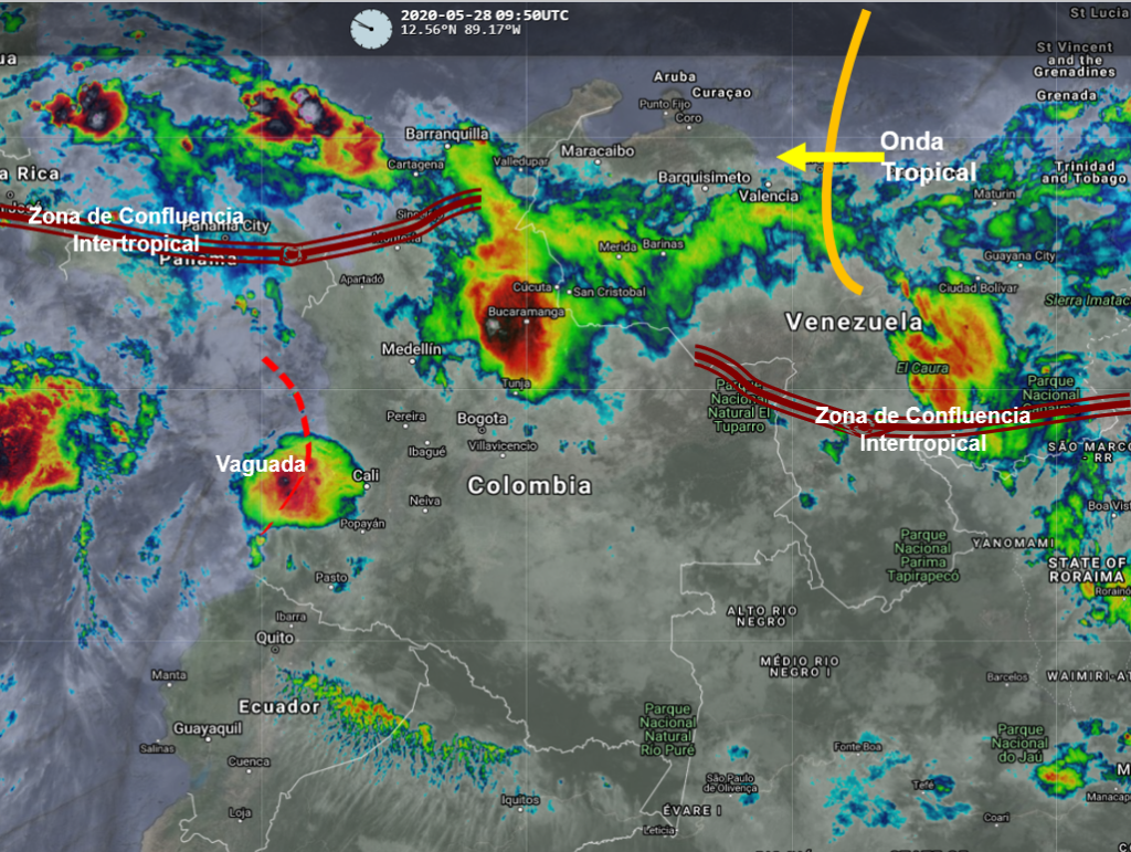 La interacción de la Zona de Confluencia Intertropical con una Vaguada en el pacífico y el paso de una Onda Tropical del Este, generan inestabilidad atmosférica en varias partes del país. Se prevén lluvias moderadas a fuertes en sectores de los departamentos de Córdoba, Sucre, Bolívar, Magdalena, Cesar, Santanderes, Boyacá, Cundinamarca, Antioquia, Eje Cafetero, Cauca, Nariño, Huila y Tolima especialmente en horas de la tarde. Lluvias de menor intensidad en Putumayo, Caquetá, Meta, Casanare, Guaviare, Vaupés y Amazonas.