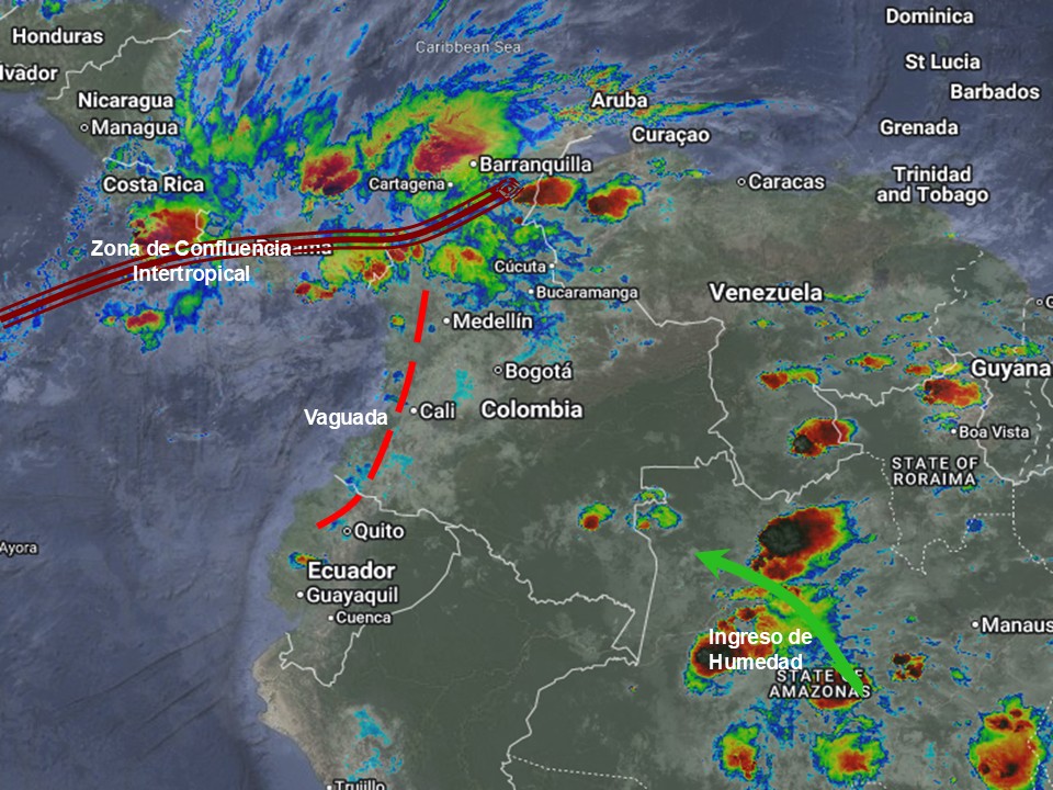 El ramal Pacífico de la Zona de Confluencia Intertropical en interacción con una Vaguada, el ingreso de humedad por el Suroriente del país, así como procesos convectivos locales, favorecen condiciones inestables que generan lluvias sectorizadas a fuertes y algunas tormentas en sectores de los departamentos de La Guajira, Atlántico, Magdalena, Cesar, Sucre, Córdoba, Antioquia, Valle del Cauca, Cauca, Nariño, Los Santanderes, Boyacá, Cundinamarca, Tolima, Huila, Guaviare, Vichada, Guainía, Vaupés y Amazonas. Precipitaciones ocasionales y lluvias de menor intensidad en los departamentos de Eje Cafetero, Arauca, Casanare, Meta, Caquetá y Putumayo.