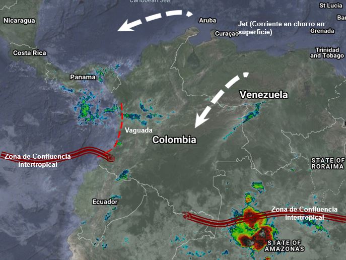 La interacción de La Zona de Confluencia Intertropical con una vaguada en el Pacifico y el ingreso de humedad por el suroriente del país, generan inestabilidad atmosférica aumentando la probabilidad de lluvias sectorizadas a moderadas en sectores de los departamentos de Cauca, Nariño, Putumayo, Vaupés y Amazonas, precipitaciones ocasionales y lluvias de menor intensidad en Antioquia, Eje Cafetero, Santander, Cundinamarca, Tolima, Huila, Caquetá y Guainía. Condiciones de tiempo seco y soleado en la región Caribe y Orinoquia debido a corrientes en chorro en superficie.