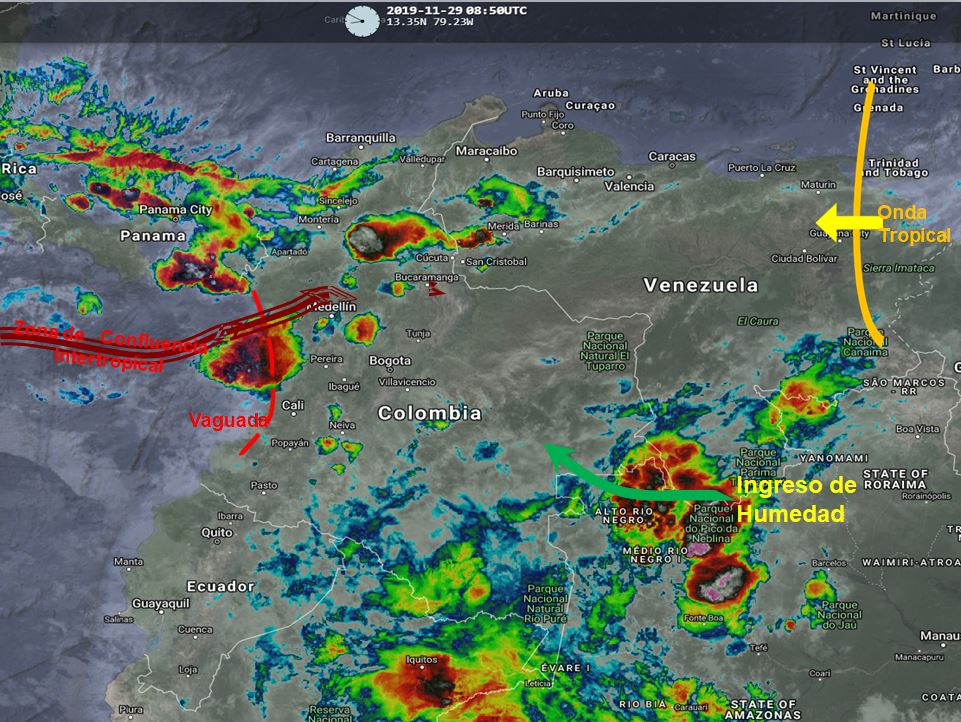 La interacción de la Zona de Confluencia Intertropical con una Vaguada en el pacifico así como el ingreso de humedad por el sur y oriente del país, generan inestabilidad atmosférica e incremento de la nubosidad, produciendo lluvias de variada intensidad especialmente en las regiones Pacífica, Orinoquia y Amazonia. Condiciones de tiempo seco en la región Caribe.
