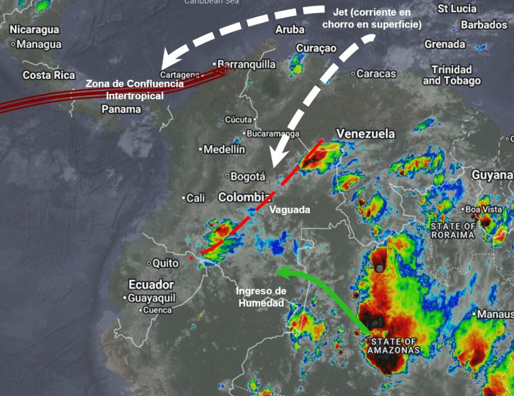 El ramal Pacífico de la Zona de Confluencia Intertropical en interacción con una Vaguada, un Sistema de Baja Presión, así como procesos convectivos locales favorecen condiciones inestables, que generan lluvias ligeras a moderadas y algunas tormentas en sectores de los departamentos de Choco, Valle del Cauca, Cauca, Nariño, Putumayo, Casanare, Meta, Guaviare, Vaupés, Caquetá, Amazonas, Guainía, Eje Cafetero, Antioquia, Tolima, Santanderes, Boyacá, Huila y Cundinamarca. Precipitaciones ocasionales y lluvias de menor intensidad en los departamentos de Bolívar, Sucre, Córdoba, Magdalena, Meta y Guaviare