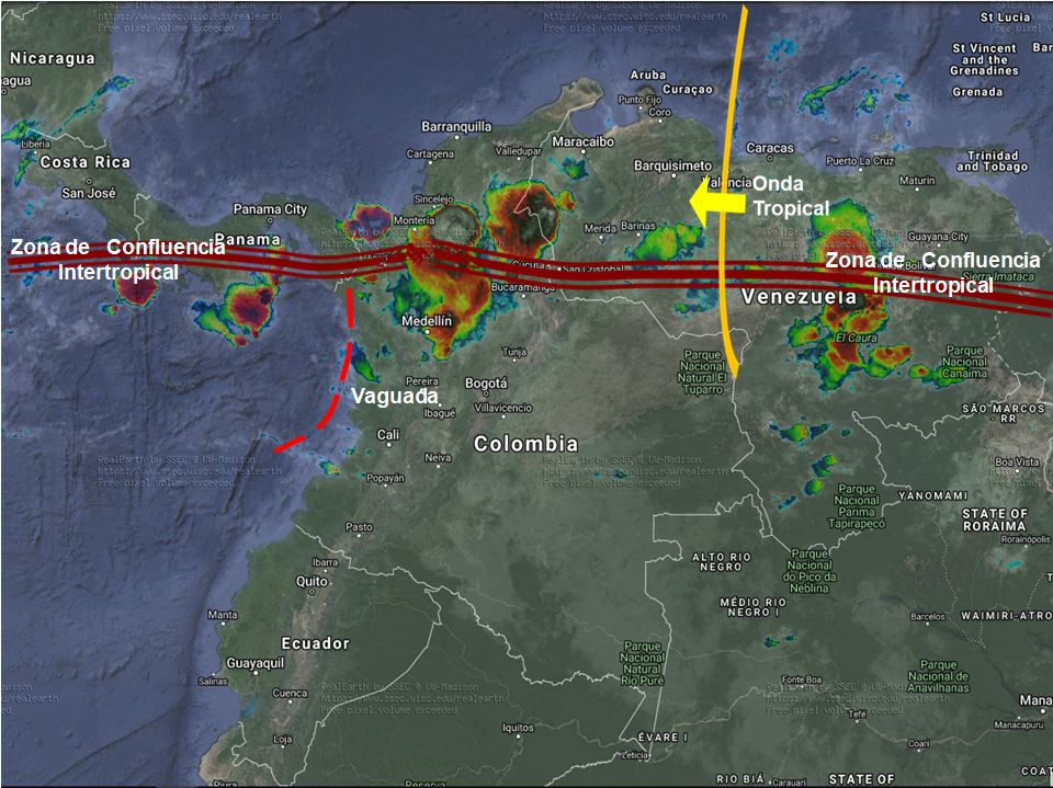 La Zona de Confluencia Intertropical en interacción con una vaguada así como el paso de Ondas Tropicales del Este, generan inestabilidad atmosférica en varias partes del país ocasionando lluvias fuertes en sectores de los departamentos de Córdoba, Sucre, Bolívar, Magdalena, Chocó, Valle del Cauca, Cauca, Nariño, Antioquia, Santander, Norte de Santander, Boyacá, Cundinamarca, Arauca, Casanare, Vichada, y Guainía.