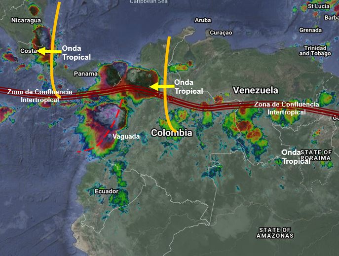 El ramal Pacifico de la Zona de Confluencia Intertropical en interacción con una Vaguada, el paso de una Onda Tropical del Este y procesos convectivos locales generan condiciones inestables, aumentando la probabilidad de lluvias moderadas a fuertes y algunas tormentas en sectores de los departamentos de Caquetá, Putumayo, Meta, Vichada, Arauca, Casanare, Boyacá, Santander, Cesar, Magdalena, Bolívar, Sucre, Córdoba, Chocó, Antioquia, Valle del Cauca, Cauca y Nariño. Precipitaciones ocasionales y lluvias de menor intensidad en Boyacá, Cundinamarca, Eje Cafetero, Tolima, Huila, Arauca, Guaviare y Guainía.