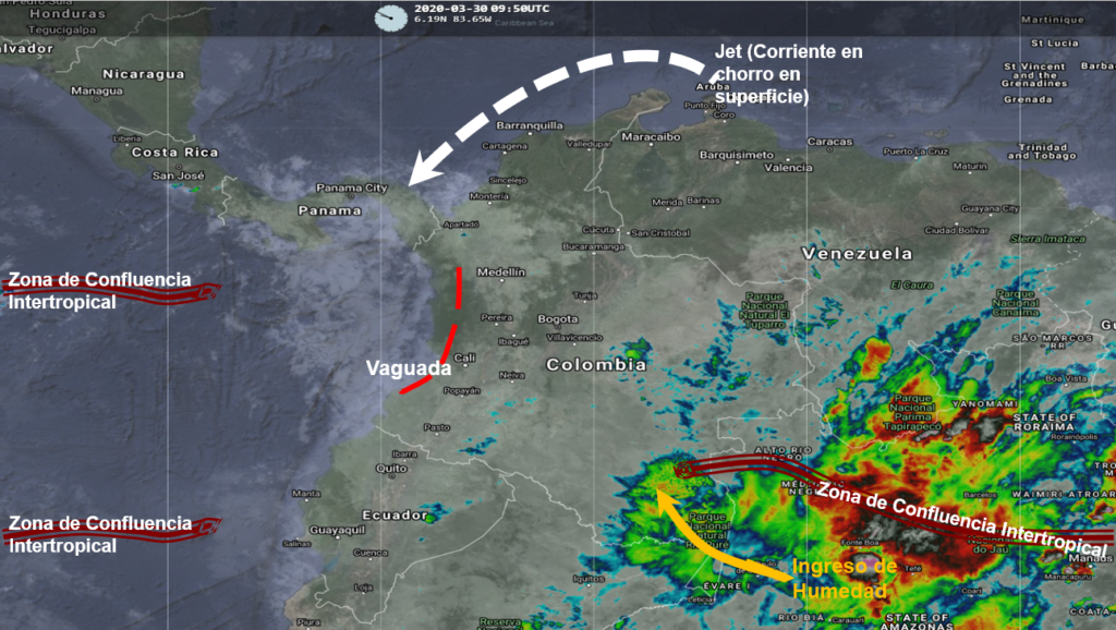 El Ingreso de humedad por el sur y oriente del país favorece el incremento de nubosidad generando lluvias de ligeras a moderadas, algunas acompañadas de actividad eléctrica, en Nariño, Putumayo, Caquetá, Guainía, Guaviare, Vaupés y Amazonas. Lluvias de menor intensidad en Valle, Cauca, Antioquia, Eje Cafetero, Tolima, Huila, Cundinamarca, Boyacá y Santander. Predominio de tiempo seco en la región Caribe con presencia de vientos fuertes en la zona marítima, especialmente en horas de la tarde y noche con intensidades entre 25 y 35 nudos (45 a 65 km/h).