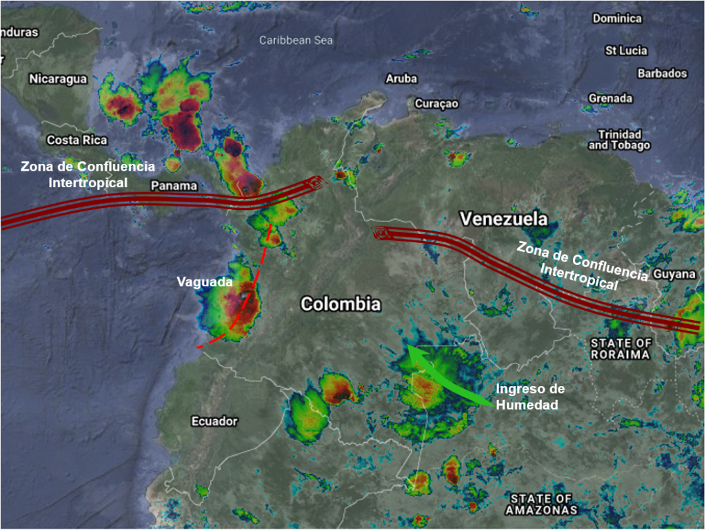 La interacción de la Zona de Confluencia Intertropical con una Vaguada en el Pacifico y el ingreso de humedad por el Sur y Oriente del país generan inestabilidad atmosférica en gran parte del territorio nacional. Las lluvias más fuertes en horas de la tarde y primeras horas de la noche, especialmente en sectores de los departamentos de Magdalena, Bolívar, Norte de Santander, Santander, Boyacá, Cundinamarca, Antioquia, Tolima, Huila, Eje Cafetero, Chocó, Valle del Cauca, Cauca, Nariño, Amazonas, Caquetá, Vaupés, Guainía, Vichada y Meta.
