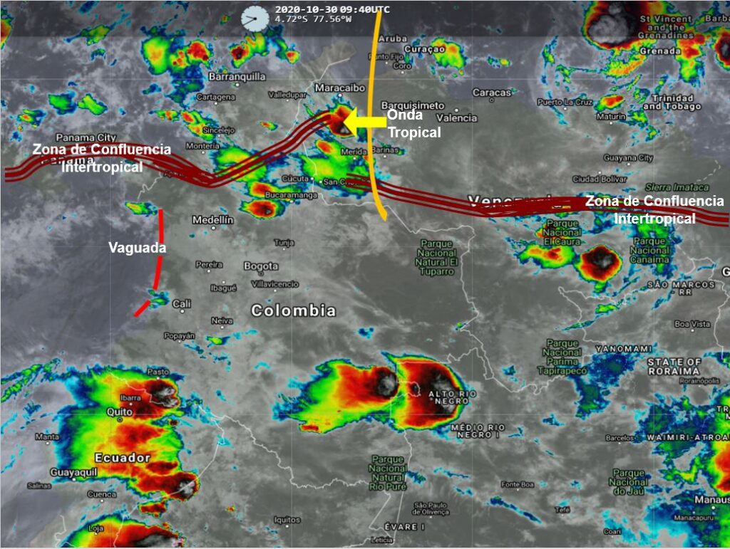 La interacción de la Zona de Confluencia Intertropical con una Vaguada en el Pacífico y el paso de Ondas Tropicales del Este, generan condiciones inestables en varias partes del territorio nacional, favoreciendo la presencia de lluvias variada intensidad, algunas acompañadas de actividad eléctrica, en sectores de los departamentos de La Guajira, Cesar, Magdalena, Bolívar, Santanderes, Antioquia, Eje Cafetero, Chocó, Valle del Cauca, Cauca, Nariño, Huila, Tolima, Cundinamarca y Boyacá. Precipitaciones ocasionales y lluvias de menor intensidad en Atlántico, Sucre, Putumayo, Caquetá, Meta, Guaviare, Vichada, Guainía, Amazonas, Arauca, Casanare y Vaupés.