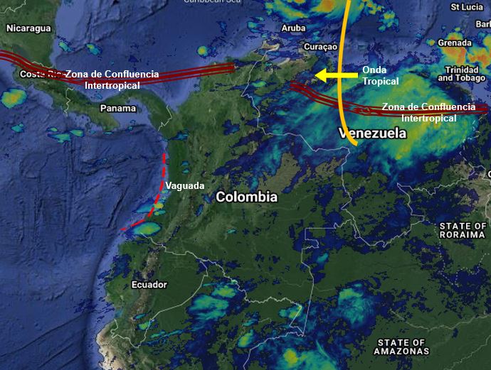 La interacción de la Zona de Confluencia Intertropical con una vaguada en el Pacífico y el paso continuo de Ondas Tropicales del Este, producen inestabilidad atmosférica en varios sectores del país, favoreciendo la probabilidad de lluvias ligeras a moderadas, algunas acompañadas de actividad eléctrica, en los departamentos de Magdalena, Bolívar, Córdoba, Chocó, Antioquia, Valle del Cauca, Cauca, Nariño, Arauca, Casanare, Vichada, Guainía. Guaviare, Vaupés, Caquetá y Putumayo. Precipitaciones ocasionales y lluvias sectorizadas en La Guajira, Cesar, Atlántico, Sucre, Santanderes, Boyacá, Cundinamarca, Eje Cafetero, Tolima, Huila, Meta y Amazonas.