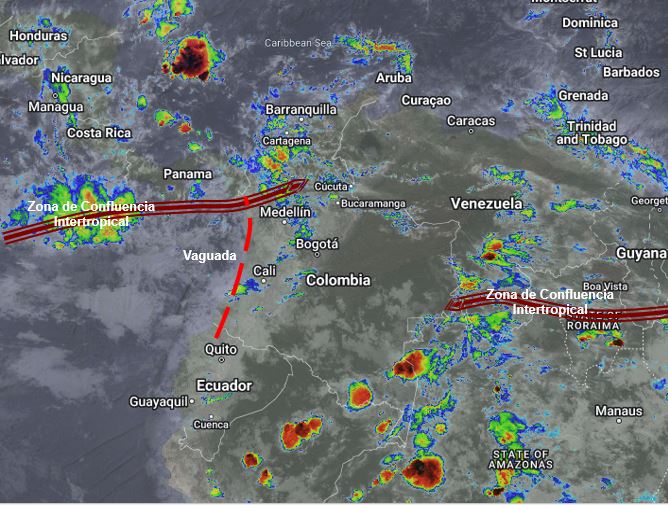 El ramal Pacífico de la Zona de Confluencia Intertropical en interacción con una Vaguada, el ingreso de humedad por el Suroriente del país y procesos convectivos locales favorecen condiciones inestables que generan lluvias sectorizadas a moderadas y algunas tormentas en sectores de los departamentos de Antioquia, Chocó, Eje Cafetero, Tolima, Valle del Cauca, Cauca, Nariño, Putumayo, Caquetá, Amazonas, Vaupés y Guainía. Precipitaciones ocasionales y lluvias de menor intensidad en los departamentos de Cesar, Magdalena, Atlántico, Bolívar, Sucre, Córdoba, Santanderes, Boyacá, Cundinamarca, Huila, Meta y Guaviare.