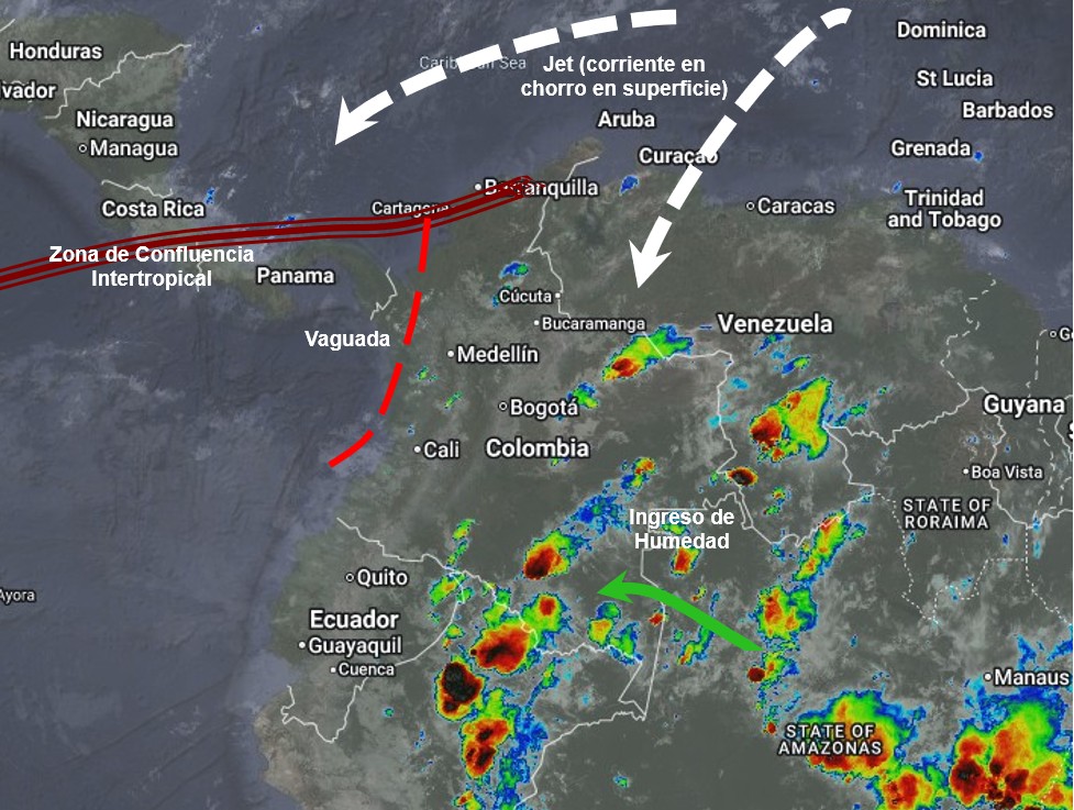 El ramal Pacífico de la Zona de Confluencia Intertropical en interacción con una Vaguada, un Sistema de Baja Presión, así como procesos convectivos locales favorecen condiciones inestables, que generan lluvias ligeras a moderadas y algunas tormentas en sectores de los departamentos de Putumayo, Casanare, Meta, Guaviare, Vaupés, Amazonas, Guainía, Boyacá y Huila. Precipitaciones ocasionales y lluvias de menor intensidad en los departamentos de Bolívar, Sucre, Córdoba, Magdalena, Choco, Valle del Cauca, Cauca, Nariño, Caquetá, Eje Cafetero, Antioquia, Tolima, Santanderes, Boyacá y Cundinamarca.