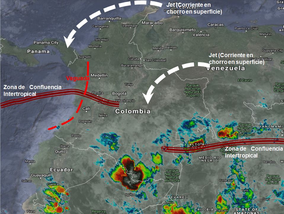 Predominio de tiempo seco en gran parte del territorio nacional. La interacción entre la Zona de Confluencia Intertropical (ZCIT) con una Vaguada, generan inestabilidad atmosférica en el suroccidente y occidente del país, favoreciendo el desarrollo de nubosidad y lluvias de variada intensidad en sectores de los departamentos de Chocó, Valle del Cauca, Cauca, Nariño, Tolima, y Huila. Al suroriente del país el ramal atlántico de la zona de confluencia intertropical (ZCIT) y el ingreso de humedad desde Brasil genera lluvias ligeras a moderadas en sectores de Putumayo, Caquetá, Amazonas, Vaupés, Guaviare, Guainía, Vichada y Meta.