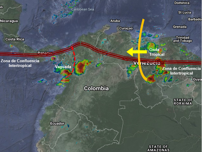 La interacción de la Zona de Confluencia Intertropical con una vaguada en niveles bajos continúa generando inestabilidad atmosférica en las regiones Pacífica, Caribe y Andina. lluvias de variada intensidad y algunas tormentas, especialmente en horas de la tarde y noche en sectores de los departamentos de La Guajira, Magdalena; Cesar, Bolívar, Córdoba, Sucre, Antioquia, Chocó, Caldas, Risaralda, Valle del Cauca, Cauca, Norte de Santander, Santander y Boyacá. Predominio de tiempo seco en las regiones de la Orinoquia y Amazonia.