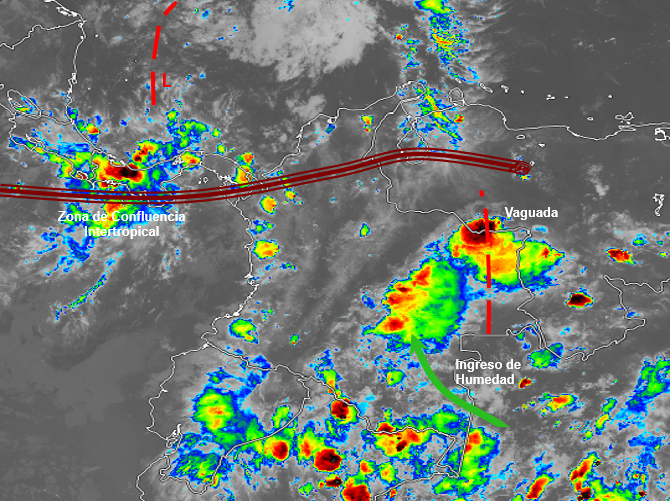 El ramal Pacífico de la Zona de Confluencia Intertropical en interacción con una Vaguada, el ingreso de humedad por el Suroriente del país y procesos convectivos locales favorecen condiciones inestables que generan lluvias ligeras a moderadas y algunas tormentas en sectores de los departamentos de Cesar, Guajira, Magdalena, Atlántico, Bolívar, Sucre, Córdoba, Antioquia, Santanderes, Boyacá, Cundinamarca, Eje Cafetero, Chocó, Valle del Cauca, Cauca, Nariño, Putumayo, Caquetá, Meta, Guainía, Amazonas y Vichada. Precipitaciones ocasionales y lluvias de menor intensidad en los departamentos de Arauca, Casanare, Meta, Guaviare, Vaupés, Huila y Tolima.