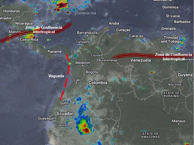 El ramal Pacífico de la Zona de Confluencia Intertropical en interacción con una Vaguada y procesos convectivos locales, favorecen condiciones inestables que generan lluvias ligeras a moderadas, algunas acompañadas de actividad eléctrica en sectores de los departamentos de Magdalena, Cesar, Bolívar, Córdoba, Santanderes, Antioquia, Chocó, Valle del cauca, Cauca, Nariño, Cundinamarca, Boyacá, Caquetá, Guaviare, Meta, Guainía, Vichada, Casanare y Arauca. Precipitaciones ocasionales y lluvias de menor intensidad en los departamentos de La Guajira, Atlántico, Sucre, Eje Cafetero, Tolima, Huila, Putumayo, Amazonas y Vaupés.