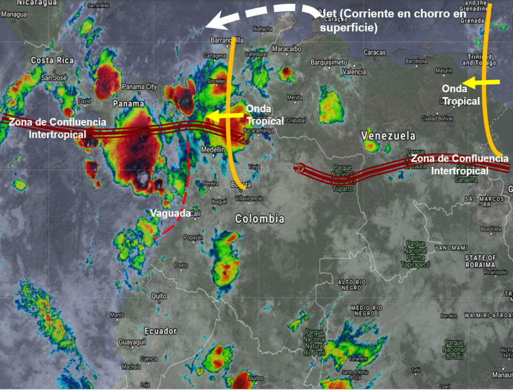 El ramal pacifico de la Zona de Confluencia Intertropical en interacción con una vaguada y el paso de Ondas Tropicales del Este, favorecen condiciones inestables en varias partes del territorio nacional, generando lluvias de variada intensidad y algunas tormentas en sectores de los departamentos de Nariño, Cauca, Valle, Chocó, Antioquia, Córdoba, Sucre, Bolívar, Norte de Santander, Santander, Vichada, Arauca, Casanare, Meta, Guaviare, Caquetá y Putumayo; lluvias ligeras en Eje Cafetero, Tolima, Huila, Cundinamarca y Boyacá.