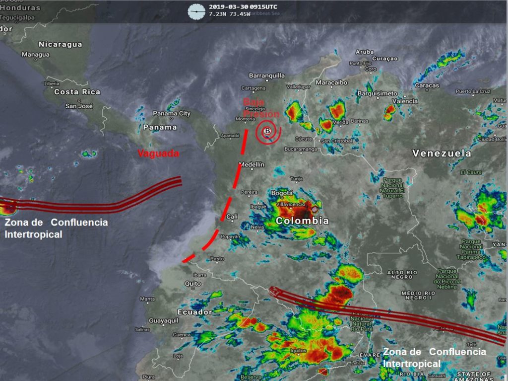 La interacción entre la Zona de Confluencia Intertropical (ZCIT) con una Vaguada y un Sistema de Baja Presión, generan inestabilidad atmosférica en el norte, centro y occidente del país, favoreciendo el desarrollo de nubosidad y lluvias de moderada intensidad en sectores de los departamentos de Bolívar, Cesar, Norte de Santander, Antioquia, Chocó, Valle del Cauca, Cauca, Nariño, Tolima, Caldas, Risaralda, Cundinamarca, Santander y Boyacá. El ramal Atlántico de la Zona de Confluencia Intertropical (ZCIT) genera lluvias de moderadas a fuertes en el suroriente del país, especialmente en sectores de Caquetá, Putumayo, Guaviare, Amazonas, Vichada, Vaupés, Guainía, Casanare, Arauca y Meta.