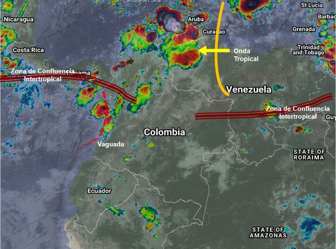 La interacción de la Zona de Confluencia Intertropical con una Vaguada y el ingreso de humedad desde el oriente, debido al paso de Ondas Tropicales del Este, generan inestabilidad atmosférica en varias partes del país, probabilidad de lluvias moderadas a muy fuertes especialmente en sectores del occidente, centro y norte del territorio nacional, afectando los departamentos de Cesar, Norte de Santander, Santander, Magdalena, Bolívar, Sucre, Córdoba, Antioquia, Chocó, Valle del Cauca, Eje Cafetero, Guaviare, Caquetá. Precipitaciones ocasionales y lluvias sectorizadas en las regiones de la Orinoquia y Amazonía.