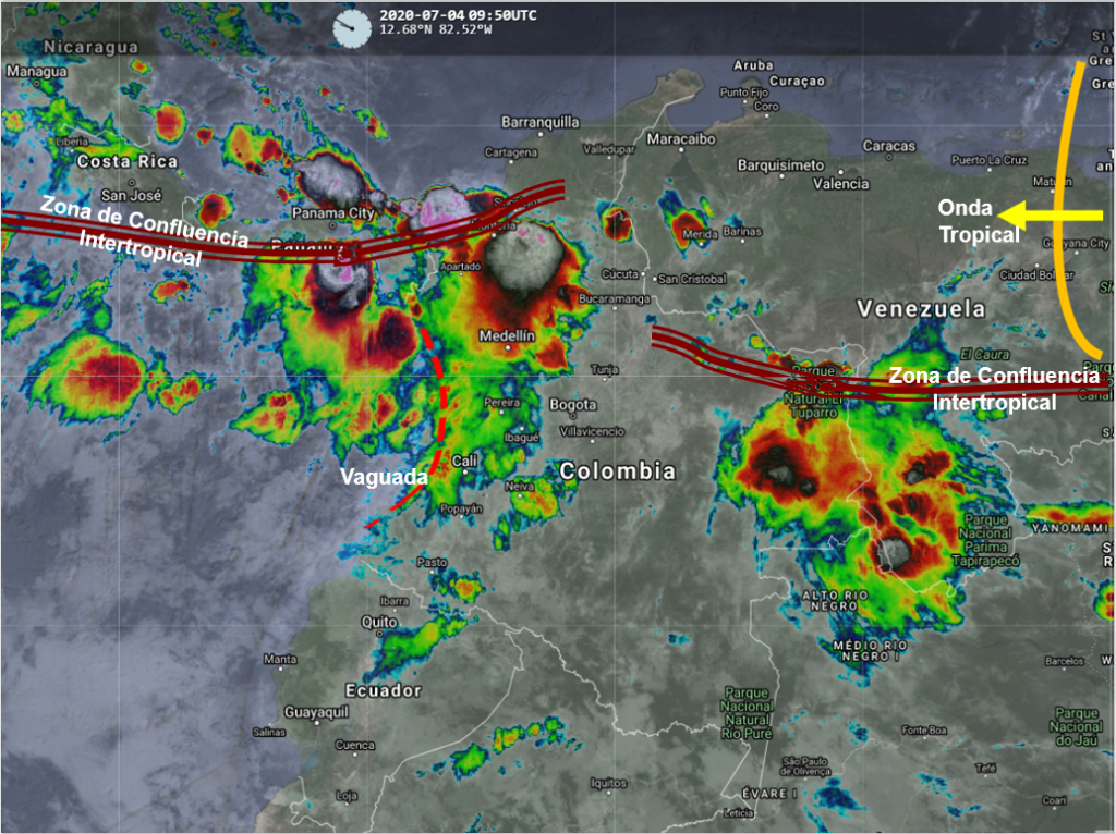 La interacción de la Zona de Confluencia Intertropical con una vaguada en el pacífico y el paso de Ondas Tropicales del Este, generan inestabilidad atmosférica en el occidente, centro y nororiente del territorio nacional. Para el fin de semana se prevén lluvias de variad intensidad, algunas acompañadas de actividad eléctrica, especialmente en horas de la tarde en los departamentos de Chocó, Antioquia, Córdoba, Sucre, Bolívar, Atlántico, Magdalena, Cesar, Santanderes, Eje Cafetero, Guaviare, Vaupés, Caquetá y Amazonas. Lluvias de menor intensidad en Boyacá, Cundinamarca, Valle del Cauca, Cauca, Nariño, Meta, Vichada y Guainía.