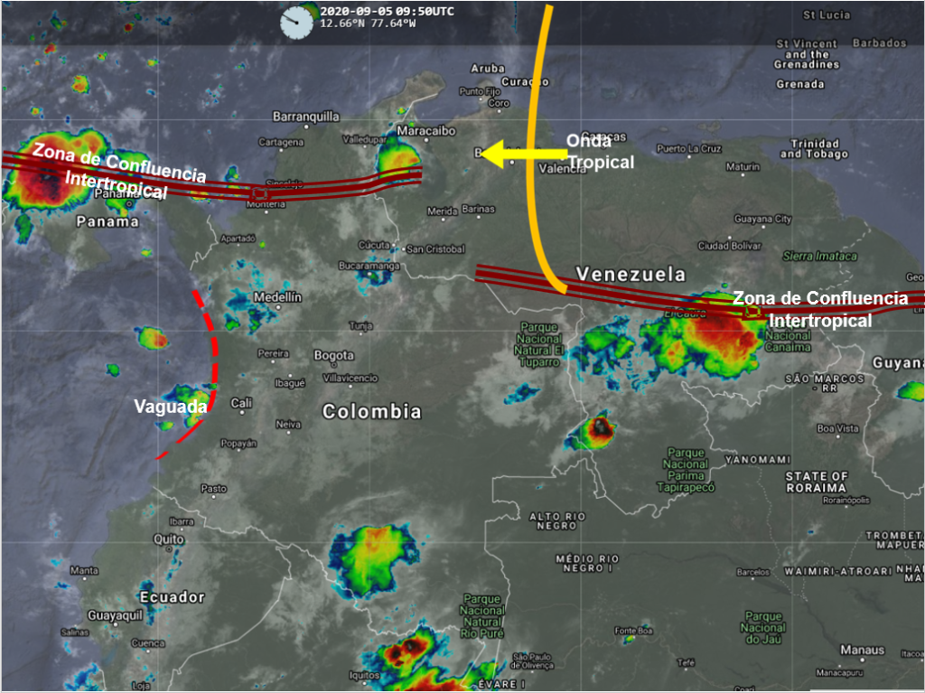 La interacción de la Zona de Confluencia Intertropical con una vaguada en el Pacifico y el paso continuo de Ondas Tropicales del Este, generan inestabilidad atmosférica en varias partes del país, favoreciendo que se presenten lluvias de variada intensidad, algunas acompañadas de actividad eléctrica, en sectores de los departamentos de Guajira, Magdalena, Cesar, Atlántico, Bolívar, Sucre, Córdoba, Chocó, Antioquia, Norte de Santander y Santander. Precipitaciones ocasionales y lluvias de menor intensidad en Valle del Cauca, Cauca, Nariño, Vichada, Casanare, Arauca, Boyacá, Cundinamarca, Eje Cafetero, Tolima, Huila, Putumayo, Caquetá, Guaviare y Meta.