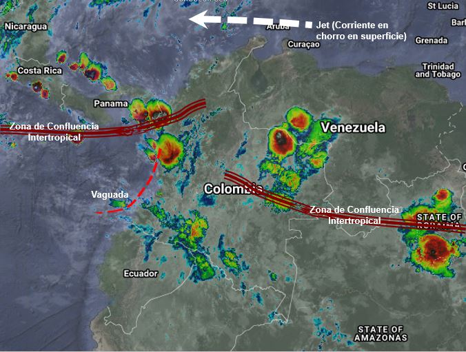 La interacción de la Zona de Confluencia Intertropical con una vaguada y el ingreso de humedad por el sur y oriente del país, generan inestabilidad atmosférica favoreciendo el incremento de nubosidad generando lluvias de ligeras a muy fuertes en los departamentos de Chocó, Antioquia, Córdoba, Bolívar, Magdalena, Cesar, Santander, Arauca, Vichada, Guainía, Guaviare, Vaupés, Caquetá y Amazonas. Precipitaciones ocasionales y lluvias de menor intensidad en Eje Cafetero, Tolima, Huila, Valle del Cauca, Cauca, Nariño, Putumayo, Cundinamarca, Boyacá, Casanare, Meta, Norte de Santander y Sucre.