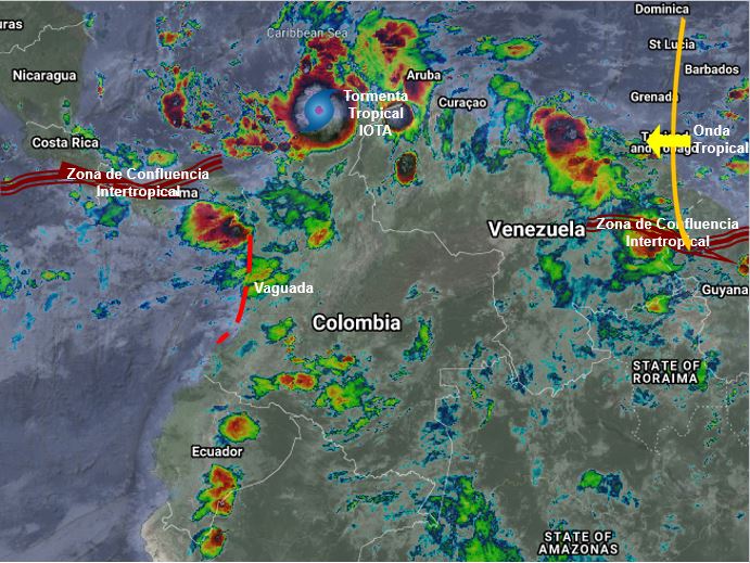 El paso la Tormenta Tropical IOTA por el Mar Caribe y el ingreso de Ondas Tropicales del Este, generan inestabilidad atmosférica en algunas zonas del territorio nacional, aumentando la probabilidad de lluvias moderadas a fuertes y algunas tormentas en sectores de los departamentos de La Guajira, Cesar, Magdalena, Atlántico, Sucre, Córdoba, Antioquia, Chocó, Caquetá, Meta, Boyacá, Norte de Santander, Arauca, Vaupés y Amazonas. Precipitaciones ocasionales y lluvias de menor intensidad, en Nariño, Cauca, Valle del Cauca, Tolima, Huila, Eje Cafetero, Cundinamarca, Santander, Casanare, Guaviare y Vichada.