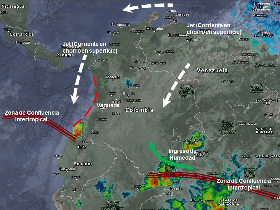 La interacción de la Zona de Confluencia intertropical con una Vaguada al occidente del país podría generar algunas precipitaciones ocasionales y lluvias sectorizadas en los departamentos de Antioquia, Santanderes, Boyacá, Cundinamarca, Eje cafetero, Tolima, Huila, Chocó, Valle del Cauca, Cauca y Nariño. El Ingreso de humedad por el sur del país genera lluvias sectorizadas en Amazonas. Vaupés, Guaviare, Guainía, Caquetá y Putumayo. Vientos fuertes y predominio de tiempo seco en la región Caribe y Orinoquia con intensidades entre 25 y 35 nudos (50 a 70 km/h) debido a corrientes en chorro en superficie.