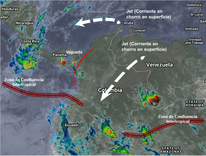 La interacción de la Zona de Confluencia Intertropical con una vaguada en el Pacifico, genera inestabilidad atmosférica ocasionando lluvias de variada intensidad y tormentas aisladas en sectores de los departamentos de Chocó, Antioquia, Valle, Cauca y Nariño. El ingreso de humedad por el sur y oriente del país incrementa la nubosidad favoreciendo la presencia de lluvias en Amazonas, Putumayo, Caquetá, Guaviare y Vaupés. Procesos convectivos locales generan precipitaciones ocasionales y lluvias sectorizadas en Santander, Cundinamarca, Boyacá, Huila, Eje Cafetero y Tolima. Corrientes de viento en chorro en superficie sobre la zona costera del mar Caribe y la Orinoquia favorecen condiciones de tiempo seco en Córdoba, Magdalena, Atlántico, La Guajira, Sucre, Arauca, Meta, Vichada y Casanare.