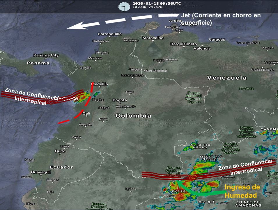 Predominio de tiempo seco en la mayor parte del territorio nacional. La interacción de la Zona de Confluencia Intertropical con una Vaguada en el pacifico, generan inestabilidad atmosférica incrementando la nubosidad y produciendo lluvias de variada intensidad, algunas acompañadas de actividad eléctrica, especialmente en sectores de los departamentos de Nariño, Cauca, Valle del Cauca y Chocó. El ingreso de humedad por el sur del país favorece la presencia de lluvias ligeras en Amazonas, Vaupés, Guainía, Guaviare, Caquetá y Putumayo. Corrientes de viento en superficie (LLJ) favorecen condiciones de tiempo seco en la región Caribe.