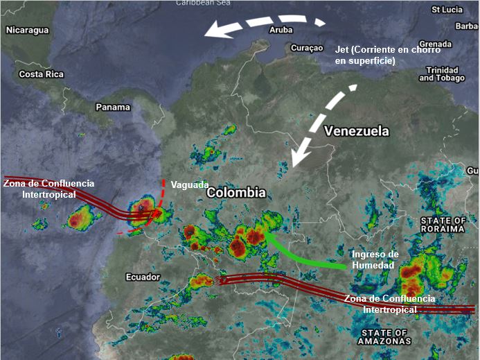 La interacción de la Zona de Confluencia Intertropical con una vaguada en el Pacifico, genera inestabilidad atmosférica ocasionando lluvias de variada intensidad y tormentas aisladas en sectores de los departamentos de Chocó, Antioquia, Valle del Cauca, Cauca y Nariño. El ingreso de humedad por el sur y oriente del país incrementa la nubosidad con probabilidad de lluvias moderadas a fuertes en Amazonas, Putumayo, Caquetá, Guaviare, Vichada, Guainía y Vaupés. Procesos convectivos locales generan precipitaciones ocasionales y lluvias sectorizadas en Santander, Cundinamarca, Boyacá, Eje Cafetero, Huila y Tolima. Corrientes de viento en chorro en superficie sobre la región Caribe y la Orinoquia favorecen condiciones de tiempo seco.