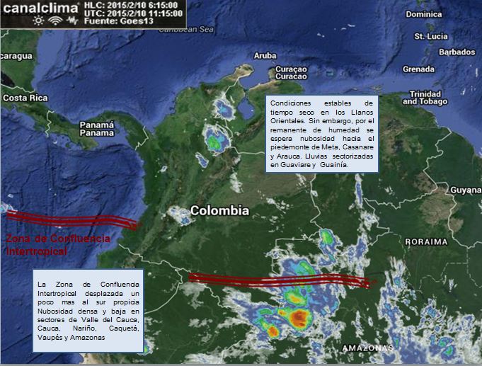La Zona de Confluencia Intertropical desplazada un poco más al sur propicia nubosidad densa y baja en sectores de Valle del Cauca, Cauca, Nariño, Caquetá, Vaupés y Amazonas. Condiciones estables en los Llanos Orientales. Sin embargo, por el remanente de humedad se espera nubosidad hacia el piedemonte de Meta, Casanare y Arauca. Lluvias sectorizadas en Guaviare y Guainía.