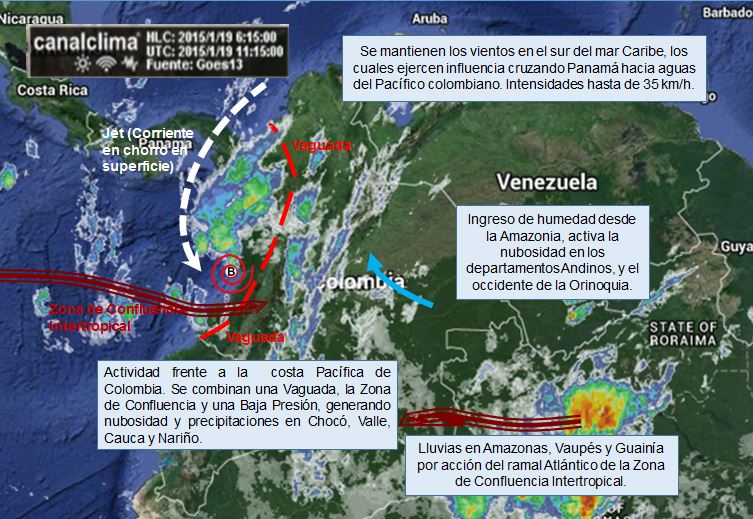 Asimismo, Ingreso de humedad desde la Amazonía, activa la nubosidad en los departamentos Andinos, y el occidente de la Orinoquia. Lluvias en Amazonas, Vaupés y Guainía por acción del ramal Atlántico de la Zona de Confluencia Intertropical.