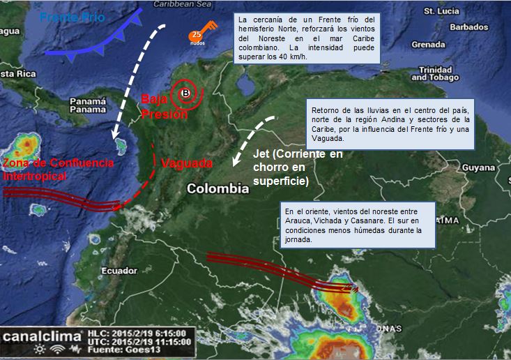 Retorno a condiciones atmosféricas inestables traerán lluvias en sectores de la región Caribe y norte de la Andina, debido a la influencia que ejercerá un Frente frío del Hemisferio norte y una Vaguada en el occidente del país.