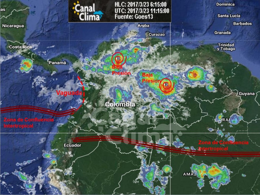 Dos sistemas de Baja Presión generan precipitaciones fuertes en Cesar, Norte de Santander, Santander, oriente Antioqueño, Meta, Guainía y Vichada, en horas de la mañana.