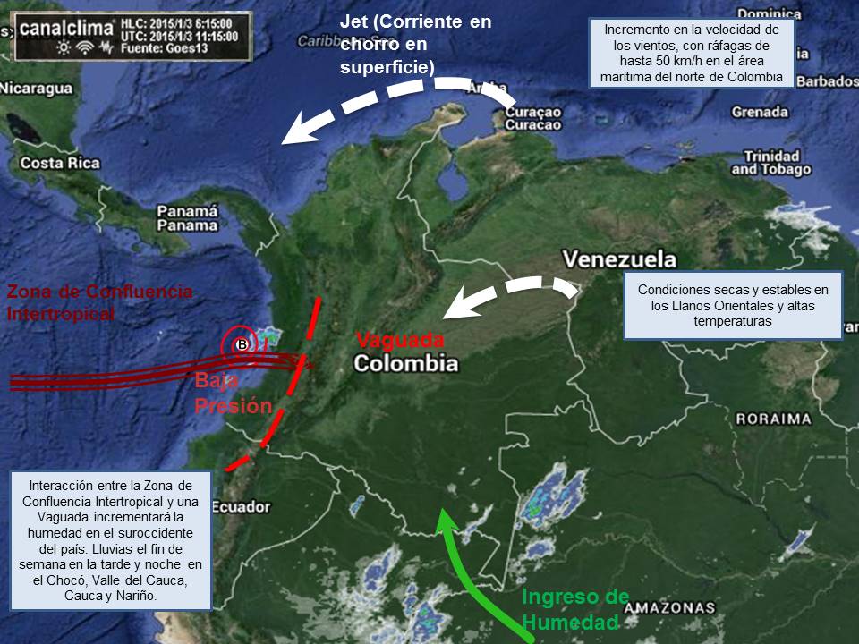 Durante este fin de semana, la Zona de Confluencia Intertropical “ZCIT”, unida a una baja presión incrementa la actividad de nubosidad sobre el Chocó, Valle, Cauca y