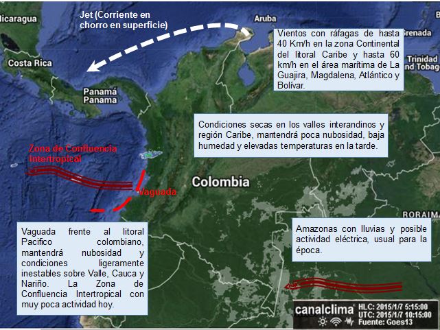 El resto del país con nubosidad escasa. Altas temperaturas en los valles interandinos, en especial Huila, Tolima, Valle, Antioquia, Eje Cafetero, Altiplano Cundiboyacense, Santanderes, y los departamentos de la región Caribe. Asimismo, continuará la influencia marcada de vientos entre moderados y fuertes en la zona costera de La Guajira, Magdalena, Atlántico y Bolívar (entre 20 y 40 km/h) y fuertes en el área marítima del mar Caribe colombiano (ráfagas de hasta 60 km/h).